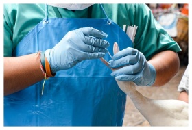 A field epidemiologist performing a mouth swab inside the beak of a white duck, in order to carry out an infectious disease investigation. Original image sourced from US Government department: Public Health Image Library, Centers for Disease Control and Prevention. Under US law this image is copyright free, please credit the government department whenever you can”.