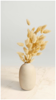 A simple, elegant composition featuring a minimalist ceramic vase with dried, fluffy flowers.