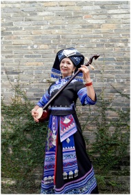Woman in traditional Zhuang attire playing a string instrument against a brick wall.