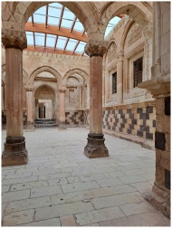 Interior view of ancient stone arches and columns