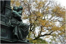 A bronze statue set against vibrant autumn leaves in Vienna, Austria, showcasing artistic craftsmanship.
