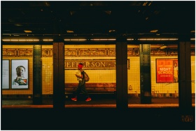 A person wearing bright sneakers walks through Jefferson subway station, capturing urban life in New York City.