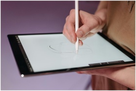 Hand using stylus pen on a tablet for sketching, showcasing modern digital design tools.