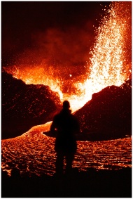 A silhouette stands before a vibrant eruption, showcasing glowing lava and intense flames.