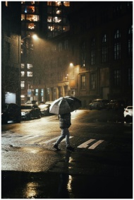 A lone figure walks through a rainy Seattle street