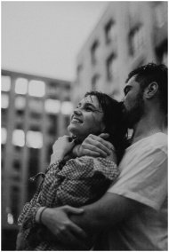 Black and white photo of a couple embracing joyful