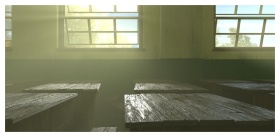 A peaceful classroom with empty desks, American fl