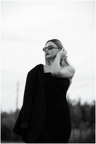 Stylish black and white portrait of a model outdoors in an elegant pose.