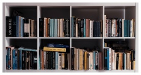 Bookshelves filled with diverse books in a cozy in