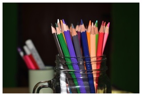 Vibrant colored pencils arranged on a chalkboard b