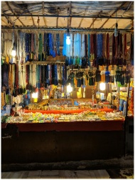 Vibrant indoor market booth showcasing hanging threads, beads, and colorful displays at night.