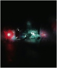 Misty window with 'Go!' written, illuminated by colorful light reflections at night.