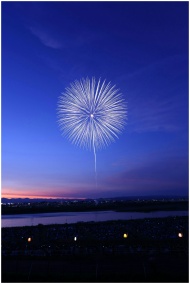 Majestic fireworks display against a dusky sky over water, capturing the essence of celebration and tranquility.