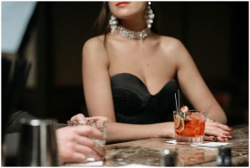 A woman in an elegant dress enjoys a cocktail at a chic bar, creating a sophisticated ambiance.