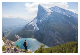 A man in a yellow jacket hikes along a grassy hill