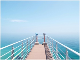 Experience the serenity of a sunny day on a coastal pier overlooking the tranquil sea.