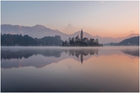 Tranquil morning view of Lake Bled with misty reflections and church silhouette.