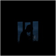 Moody silhouette of a person framed by a window with a dark, twilight sky in the background.