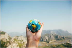 Hand holding a globe against a mountain background symbolizing travel and exploration.