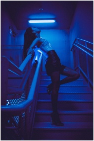 A woman strikes a dramatic pose on a neon-lit staircase, conveying a moody atmosphere.