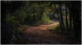 Captivating forest trail with lush foliage in soft autumn light, Dimitrovgrad, Bulgaria.