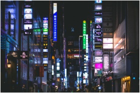 Colorful neon signs illuminate the bustling street