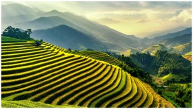 Scenic view of lush green rice terraces in Gia Lai, Vietnam under sunlight.
