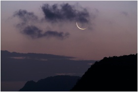 Crescent moon with dark clouds in twilight sky over Phang-nga, Thailand.