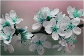 A close-up shot of blooming white flowers with green accents against a soft pink background.