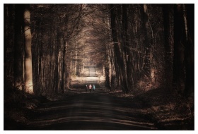 A tranquil forest road with golden sunlight filter