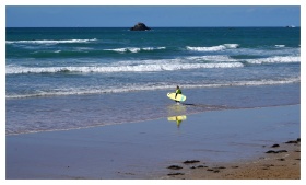 Man doing a handstand on a sunny beach with surfer