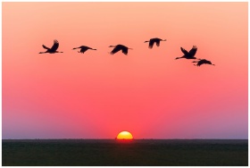 A serene image of birds in flight silhouetted agai