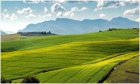 Lush green fields under a blue sky with distant mountains.