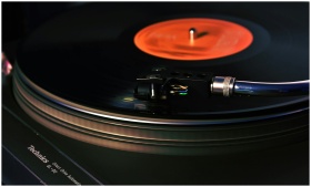 Close-up image of a vintage turntable playing a vinyl record, showcasing analog technology.