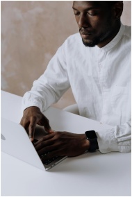 Young man working remotely on laptop in a stylish
