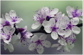 Beautiful macro capture of cherry blossom flowers with purple stamens in springtime.