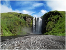 A breathtaking view of a waterfall cascading amidst vibrant green hills under a blue sky.