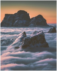 Captivating view of mountain peaks emerging through clouds at twilight, capturing nature's grandeur.