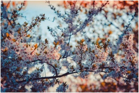 A close-up of cherry blossoms in full bloom during a sunny spring day.