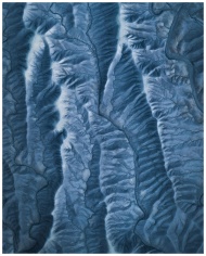 A detailed close-up of vivid blue glacier ice text