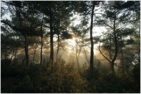 Misty forest scenery with sunbeams filtering through trees at dawn.