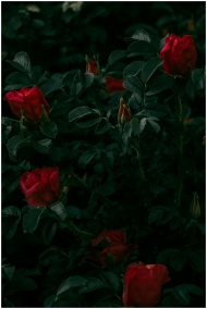 Captivating dark-themed image of vibrant red roses surrounded by lush green leaves in a garden.
