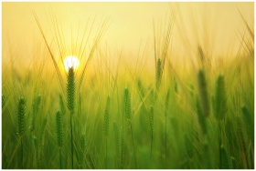 Green wheat field illuminated by the soft glow of