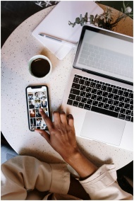 Person interacting with smartphone and laptop at a