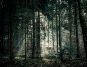 Tranquil forest scene with sunlight streaming through dense trees, creating a peaceful atmosphere.