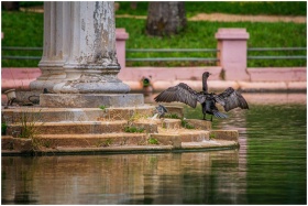 A cormorant dries its wings near a column in a serene Belo Horizonte park.