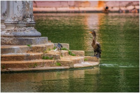 A cormorant dries its wings near a column in a ser
