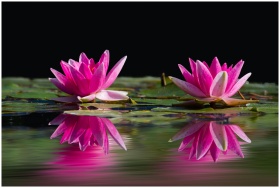 Beautiful pink water lilies reflect on a calm pond against a dark background.