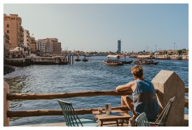 Dubai Creek Waterfront Man Sitting Abra Boats
