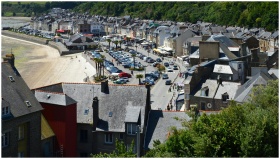 Aerial view of Cancale, France, featuring charming rooftops and coastal scenery, perfect for travel enthusiasts.